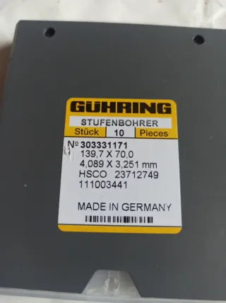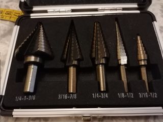 Conjunto de brocas escalonadas de diferentes tamaños y materiales. -Broca escalonada HSS KWB 4-20 mm ( 18€ ) -Broca escalonada HSS KWB 6-30 mm ( 30€ ) -Juego de 3 brocas escalonadas recubiertas de titanio ( 17€ ) -Set multifunción para taladro Parkside ( 12€ )