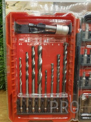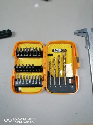 Estuche de brocas y puntas de la marca ACTER. - Incluye puntas PH1, PH2, PH3. - Incluye puntas T10, T15, T20, T25, T27, T30, T40. - Incluye brocas de 4, 5, 6, 8 y 10 mm.