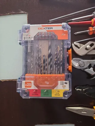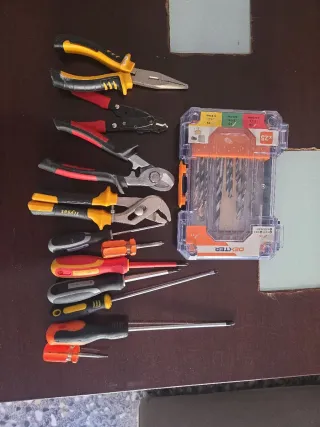 Conjunto de herramientas manuales y un set de brocas. - Alicates de punta, de corte y universales. - Pelacables. - Juego de 25 brocas Dexter para metal y madera. - Variedad de destornilladores.