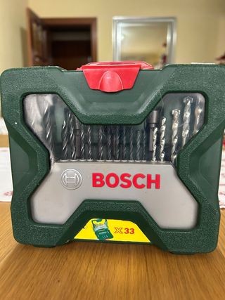 Set de 33 brocas de la marca Bosch. - Incluye brocas para diferentes materiales. - Estuche organizador de plástico verde y rojo.