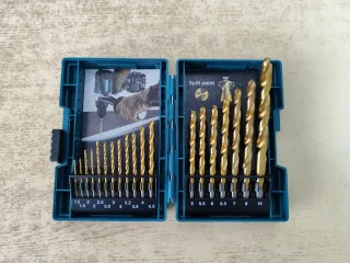 Set de brocas Makita para taladro. - Brocas de metal con punta dividida (Split point). - Incluye brocas de diferentes tamaños: 1.5, 2, 2.5, 3, 3.2, 3.5, 4, 4.5, 5, 5.5, 6, 6.5, 7, 8 y 10 mm. - Estuche organizador de plástico resistente.