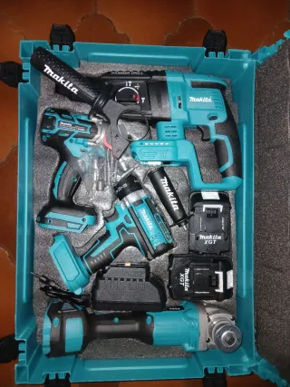 Kit de herramientas Makita en su caja original. Incluye varias herramientas eléctricas y accesorios. Baterías 4 Ah 40V - Taladro percutor - Atornillador - Amoladora - Linterna - Baterías XGT - Cargador - Brocas y accesorios