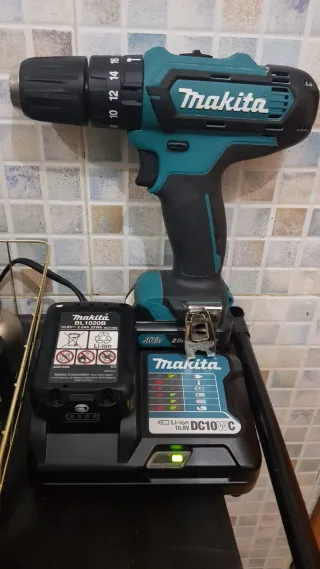 Taladro inalámbrico Makita en buen estado, listo para usar. Incluye su maletín original y varios accesorios. - Taladro inalámbrico Makita. - Maletín de transporte. - Cargador. - Batería. - Brocas y puntas variadas.