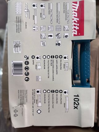 Set de accesorios Makita B68432 con 102 piezas. - Incluye brocas para metal y madera. - Estuche organizador de plástico resistente.