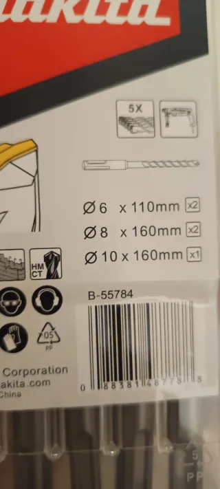 Set de brocas Makita B-55784 para martillos SDS-Plus. - Incluye brocas de 6 x 110mm (2 unidades). - Incluye brocas de 8 x 160mm (2 unidades). - Incluye broca de 10 x 160mm (1 unidad). - Fabricado en China.