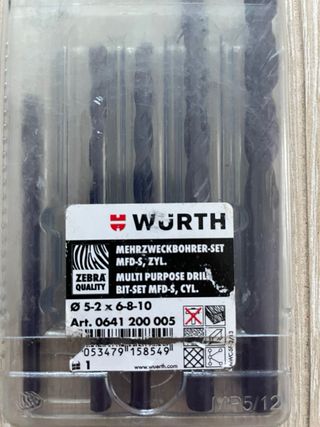 Conjunto de 5 brocas multiuso de la marca alemana Wurth. Sirven para perforar la mayoria de materiales (azulejos, ladrillo macizo, tejas, ladrillo hueco, piedra, marmol, madera, plastico, metal...). Tambien son ideales para la instalacion de ventanas. Medidas: 5, 6, 6 larga, 8 larga y 10 larga. Punta de carburo fuerte, resistente y especialmente afilada. Su punta ayuda a centrar el taladro. Anclaje de broca cilindrico, altamente resistente. No adecuadas para usar con percutor, utilizar solo con rotacion. Este producto esta nuevo, nunca ha sido usado. Se entrega con su embalaje original. Precio de venta en Wurth: 73,80€ +IVA