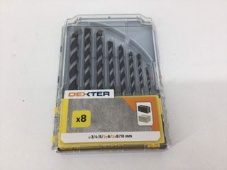 Set de 8 brocas Dexter para hormigón. Incluye diferentes tamaños para diversas aplicaciones. - 8 brocas incluidas. - Tamaños: 3, 4, 5, 2x6, 8, 10 mm. - Diseñadas para alta velocidad y durabilidad.
