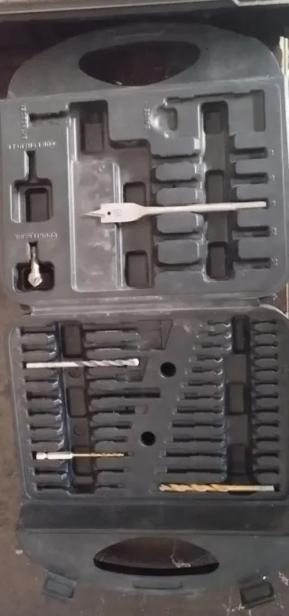 Juego de puntas y brocas. Faltan 4 brocas de las más pequeñas y el maletín no cierra. Hay piezas oxidadas, pero no afecta a su uso. Ver fotos!!