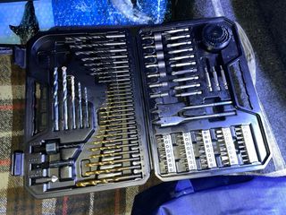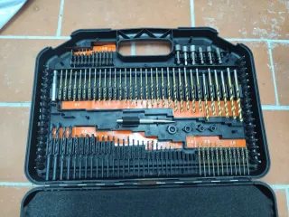 Completo kit de brocas y accesorios para todo tipo de trabajos con taladro. Incluye una gran variedad de brocas de diferentes tamaños y tipos, así como accesorios complementarios. - Brocas para metal y madera. - Brocas planas. - Sierras de corona. - Puntas de atornillar. - Adaptadores y vasos.