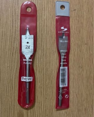 Lote de dos brocas planas para madera. - Broca SESA TOOLS de 18 mm. - Broca Hepyc de 24 mm. - Ideales para trabajos en madera. Artículos de ferretería tras cierre por jubilación. Envio solo por correos.