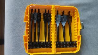 Set de brocas planas para madera de la marca DeWalt. Incluye diferentes tamaños para diversos trabajos. - Brocas de acero. - Incluye tamaños: 12, 16, 18, 20, 22, 25 y 28 mm. - Estuche organizador amarillo.
