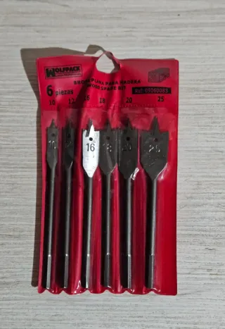 Set de 6 brocas planas para madera de la marca Wolfpack. - Incluye brocas de 10, 12, 16, 18, 20 y 25 mm. - Referencia: 09060083. Nuevo PRECIO NO NEGOCIABLE SOLO ENVIOS. NO ENTREGO EN MANO 5 anuncios =10% de descuento 10 anuncios =15% 15 anuncios =20%