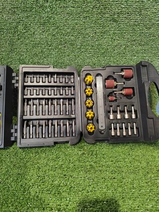 PRECINTADOS / A ESTRENAR! Vendo lote completo de 3 estuches de accesorios para taladro y atornillador de la marca Parkside. Están totalmente nuevos, nunca se han usado (ver fotos de las puntas intactas). El pack incluye: Set Brocas HSS (Naranja): Para metal, plástico y madera. Revestimiento de titanio. Set Puntas y Vasos (Azul): 37 piezas. Incluye puntas PH, PZ, Planas, Torx, Hexagonales, vasos y portapuntas magnético de cambio rápido. Set Brocas Madera (Verde): Con punta de centrado para máxima precisión en maderas duras y blandas. Estado: 10/10 (Nuevas). Precio del lote: 24€ (No negociable, es un preciazo por los tres sets nu