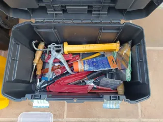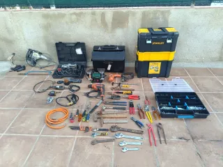 Taller móvil para trabajos de fontanería, carpintería, mecánica, etc. - Taladros martillos demoledores (Uno un par de usos para demoler y el otro solo para taladro) - Mola muela portátil - Amoladora Dremel - Atornilladores eléctricos - Taladro - Caja llena de Brocas para hormigón, madera y metal, tacos y tornillos varios, variedad de puntas estrella y planas para el taladro atornillador. -Variedad de llaves, alicates, destornilladores, martillos. - Mangueras de gas soplete, soldador. - Cajas aplicables Stanley y maletín de transporte. -Otras tantas herramientas sueltas como, tornillo de banco, llaves allen, llaves fijas, etc.