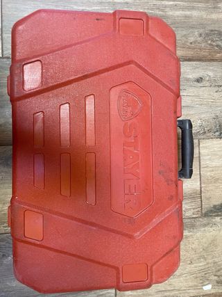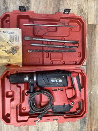 Taladro percutor Stayer HD45 en su maletín original. - Funciona correctamente - 1200W - Incluye cincel plano, cincel de pala y broca. - Maletín rojo de plástico resistente.