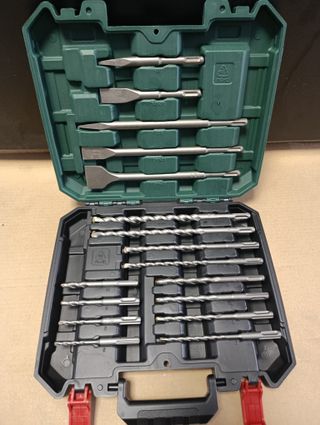 Set de brocas y cinceles de percusión Parkside. - Apto para portaherramientas según el sistema SDS-plus. - Incluye 9 brocas de 5/6/8/10/12/14/16/18/22 mm. - Incluye 1 cincel plano de 250 mm de largo con 21 mm de ancho. - Incluye 1 cincel de punta de 250 mm de largo. - Viene en un práctico estuche. Entrega en mano en vallecas zona puente o se pueden hacer envíos por la app de wallapop