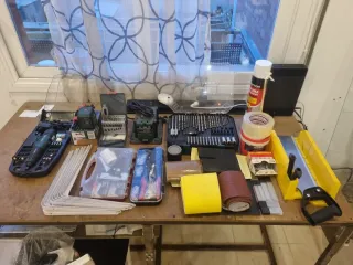 Conjunto variado de herramientas manuales y eléctricas, ideal para proyectos de bricolaje y reparaciones. Incluye cerrucho con ingletadora, tacos del 6, hojas de cutter de muchos tamaños, yeso, lijas, brocas y puntas, remachado, grapadora, afilador de cuchillos, set de machos, nivel láser con abrazadera, herramienta multinacional como dremel, escuadras en L para pared, parlante Bluetooth Se vende el lote completo por mudanza