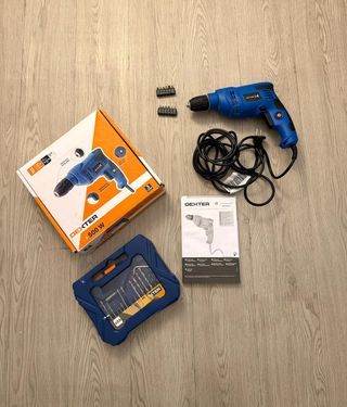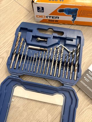 Se vende taladro Dexter de 500W junto con un set de 33 brocas y puntas. - Taladro Dexter 500W. - Set de 33 piezas (brocas y puntas). - Incluye manual de instrucciones. - En caja