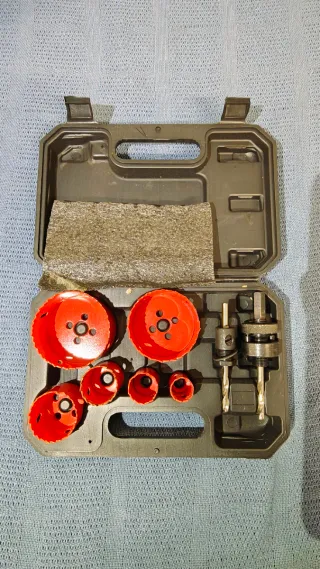 Set de sierras de corona para taladro, ideal para hacer agujeros de diferentes tamaños. - Incluye varias sierras de corona de color rojo. - Incluye adaptadores y brocas. - Viene en un estuche organizador negro.