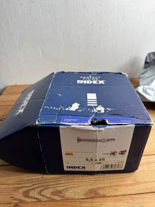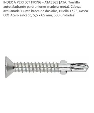 Tornillo INDEX A PERFECT FIXING modelo ATA5565. - Autotaladrante para uniones madera-metal. - Cabeza avellanada. - Punta broca de dos alas. - Huella TX25. - Rosca 60º. - Material: Acero zincado. - Medidas: 5,5 x 65 mm. - Cantidad: 500 unidades.