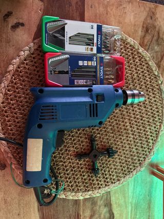 Se vende taladro eléctrico con un juego de brocas Tivoly. - Taladro de color azul. - Incluye dos cajas de brocas Tivoly. - Brocas de diferentes tamaños.