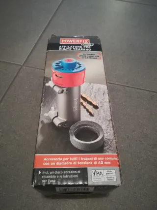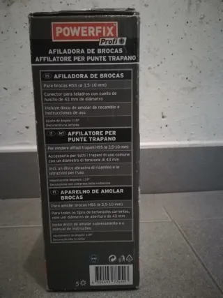 Afilador para brocas HSS de la marca Powerfix. - Permite afilar brocas HSS de 3,5-10 mm. - Accesorio para taladros de uso común con diámetro de portabrocas de 43 mm. - Incluye disco de lijado de repuesto e instrucciones.