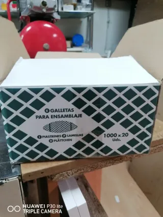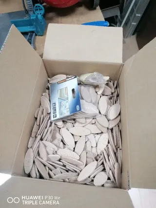 Lote de galletas de madera para uniones de carpintería. Son ideales para ensamblar muebles y estructuras de madera. - Material: Madera. - Cantidad: Aproximadamente 1000 unidades.