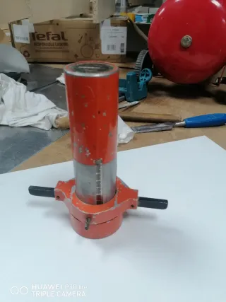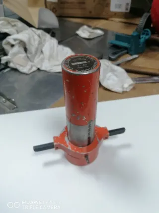Herramienta para cortar formica y aluminio. - Cuerpo principal de metal naranja. - Cilindro con marcas de medición.