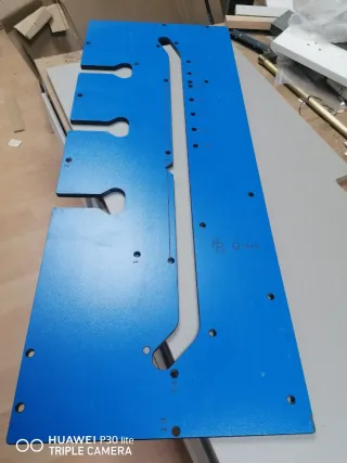 Plantilla de emboquillado de color azul, con marca HB y año 1992. El precio es de la plantilla, la fresadora está aparte - Diseño con múltiples ranuras y orificios. - Marcaciones numéricas a lo largo de una de las ranuras.