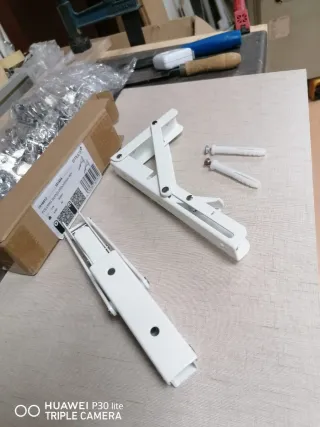 Se venden juego de escuadras abatibles de color blanco. Son ideales para estanterías o mesas plegables. - Material: Metal. - Color: Blanco. - Incluye tornillería y tacos para su instalación. Pequeñas