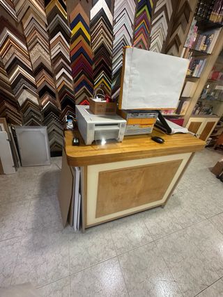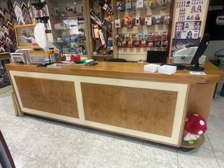 Se vende mobiliario de tienda. - Mostrador de madera con detalles en crema. - Estanterías de pared con expositores. - Vitrina de cristal. - Exhibidores para productos.