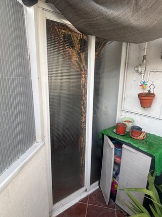 Puerta corredera de aluminio con acabado blanco. - Marco de aluminio. - Panel de vidrio texturizado.