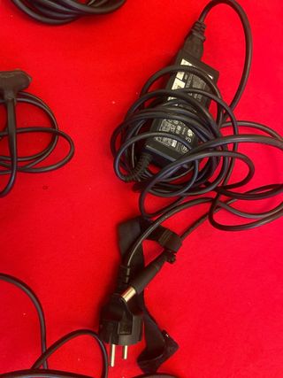 Lote de cables de alimentación y red de diferentes tipos. - Cable de alimentación con enchufe europeo. - Cable de alimentación con enchufe americano. - Cable de red Ethernet amarillo. - Cable de alimentación con adaptador de corriente.