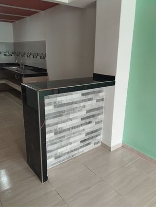 Barra de cocina con un diseño moderno y elegante, ideal para complementar tu espacio. - Encimera de granito negro brillante. - Revestimiento frontal con azulejos de mosaico en tonos grises. - Laterales con acabado en mármol negro.