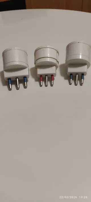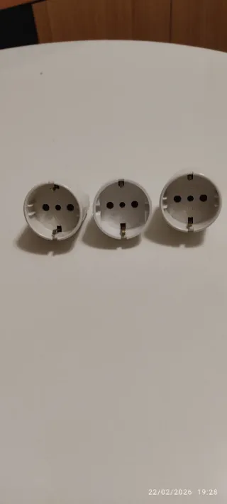 Adaptador de enchufe blanco para convertir diferentes tipos de conexiones. - Diseño compacto y ligero. - Pines metálicos para conexión eléctrica.
