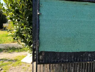 Puerta de chalet en condiciones aceptables. - Estructura metálica. - Revestimiento de malla verde y negra.