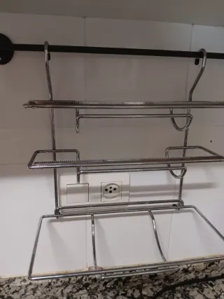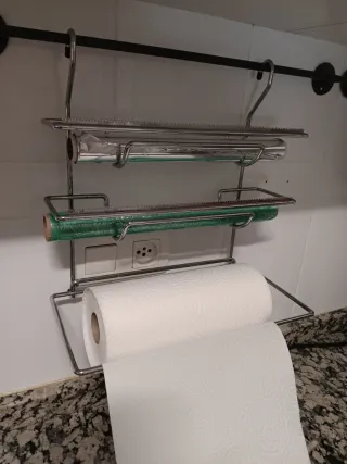 Práctico portarrollos de cocina de metal cromado. - Tres niveles para organizar papel de aluminio, film transparente y papel de cocina. - Diseño funcional para colgar en la pared o barra. - Incluye cuchillas para cortar fácilmente.