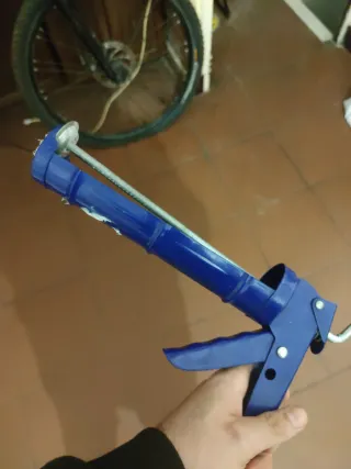 Pistola de silicona de color azul, útil para trabajos de sellado y aplicación de adhesivos. - Mango ergonómico para un mejor agarre. - Mecanismo de empuje para dispensar el material.