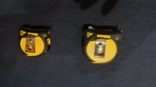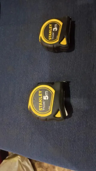 Flexómetros de la marca Stanley, modelo Tylon.Hay 4 unidades de 3 metros y 4 de 5 metros. - Cuerpo de plástico ABS resistente. - Mecanismo de freno. Los de 3 metros son a 6 euros,y los de 5 a 8 euros.