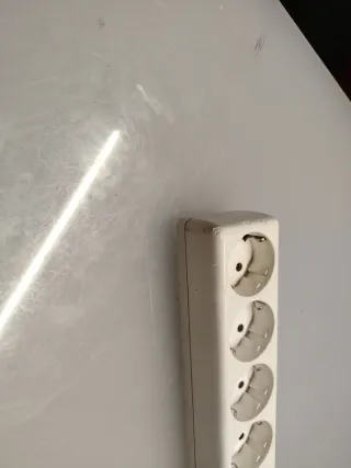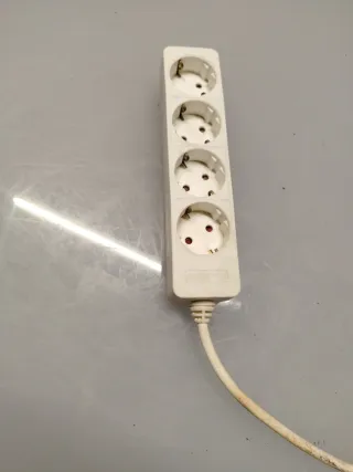Regleta blanca con cuatro enchufes y un cable de 1.45 metros. - Cuatro tomas de corriente. - Cable de alimentación de 1.45 metros.