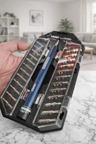 Set de destornillador eléctrico VARO con múltiples puntas de precisión. Tecnología y Funciones: Cuenta con batería recargable de 4V Li-Ion, luz LED integrada y carga mediante cable USB-C. Diseño: Diseño compacto y ergonómico ideal para trabajos de precisión en reparaciones. Incluye: Destornillador base. 21 puntas de precisión de diferentes tipos. 4 vasos. Mango ergonómico de color azul. Estuche de almacenamiento compacto.