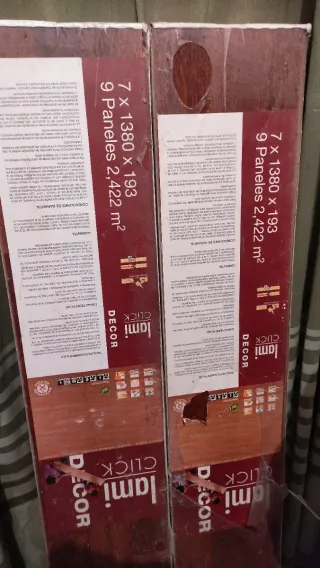 Dos paquetes de suelo laminado madera Lami Decor Click. - Cada paquete contiene 9 paneles. - Medidas por panel: 7 x 1380 x 193 mm. - Superficie total cubierta por paquete: 2,422 m². Instalación: Debe ser instalado de forma flotante, sin clavar ni pegar. Se debe dejar un espacio de dilatación de al menos 10 mm respecto a paredes y obstáculos. Se recomienda el uso de una lámina de polietileno de 2 mm.