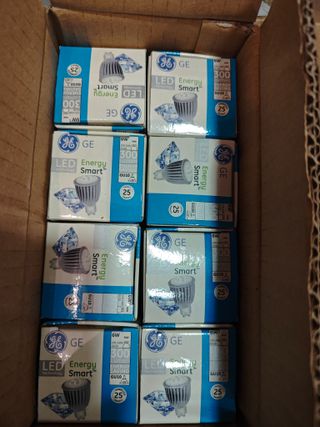 Se venden por unidades de bombillas LED de bajo consumo de la marca GE y Phillips. Primeras marcas. - Modelo: Energy Smart - Potencia: 6W - Casquillo: GU10 - Equivalencia: 45W - Luminosidad: 300 lúmenes