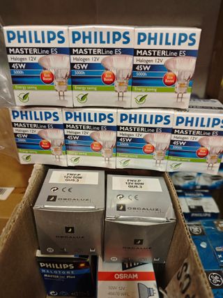 Lote de bombillas halógenas de diferentes marcas y potencia. Todas incluidas. Más de 50 Uds. - Incluye bombillas Philips FocusLine. - También bombillas Osram Starlite. - Varias bombillas LAES. - Bombillas Ledesma. - Bombillas FYEL. - Diversos voltajes y potencias.