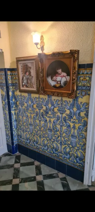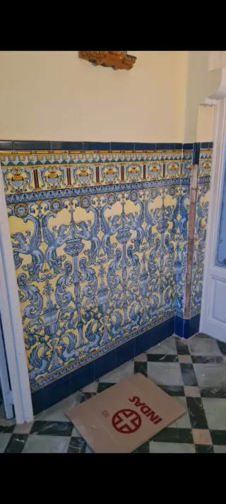 Pieza de azulejo valenciano con diseño tradicional. - Motivos florales y ornamentales. - Colores azul y amarillo predominantes. - Borde inferior azul oscuro. Ya guardados en cajas Escucho ofertas