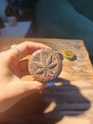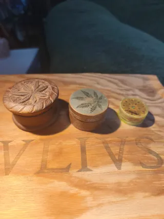 Conjunto de tres molinillos de hierbas de diferentes tamaños y materiales. Uno es de madera tallada, otro de metal con diseño de hoja y el más pequeño es de plástico y metal.