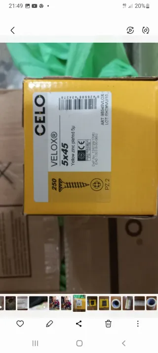 Caja de 250 tornillos Celo Velox bicromatados de 5 × 45 milímetros.De estrella Pz-2.El precio es 12 euros cada caja.