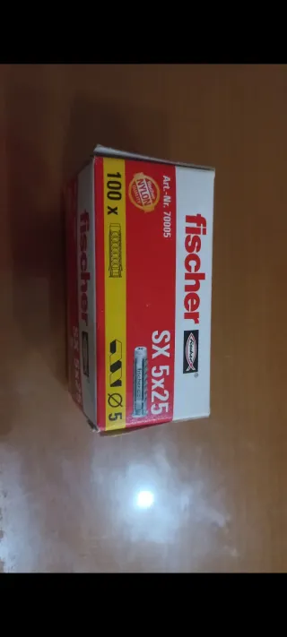 Caja de 100 tacos de la marca Fischer,de 5 × 25 milímetros.El precio es 2 euros la caja.