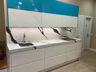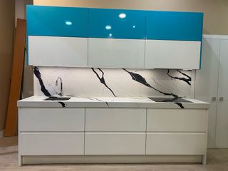 Liquidación cocina de exposición con un diseño moderno y elegante. 280cm COMPOSICION: - Mueble bajo fregad. 70x90 cubos reciclaje + cubos limpieza - Mueble bajo 70x90 2 Gavetas + cajon interior con cubertero madera - Mueble bajo placa 70x90 2 Gavetas - 6 Muebles altos transversales 45x90 - Fregadero B/E Nayes + grifo - Placa inducción 3 fuegos Nodor - Grupo filtrante Cata - Muebles de cocina en lacado blanco brillo y turquesa - Encimera y panelado porcelánicos - Herrajes de primera calidad marca HETTICH **La cocina se vende tal y como está en las fotos. El precio no incluye ni desmontaje ni trsnsporte