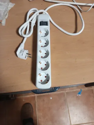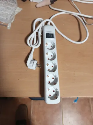 Regleta blanca con cinco enchufes y un interruptor general para controlar la alimentación de todos los dispositivos conectados. - Cinco tomas de corriente. - Interruptor de encendido/apagado. - Cable de alimentación.